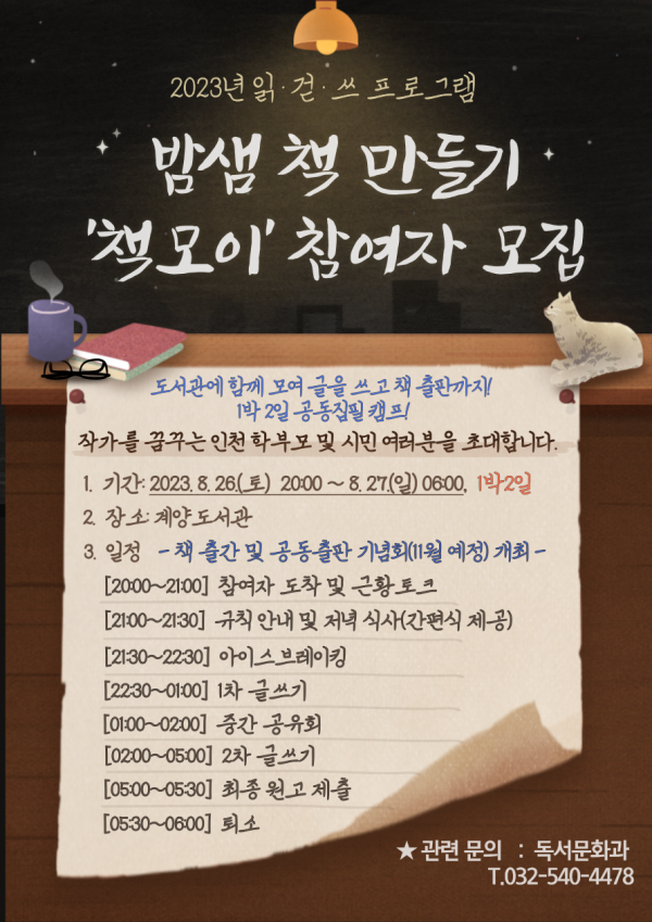 저녁 8시, 계양도서관에 모여 다음 날 오전 6시까지 함께 책 만들기를 위한 원고를 집필하고 완성된 원고는 교정·교열 등 출판 작업을 거친 후에 책으로 출간한다.