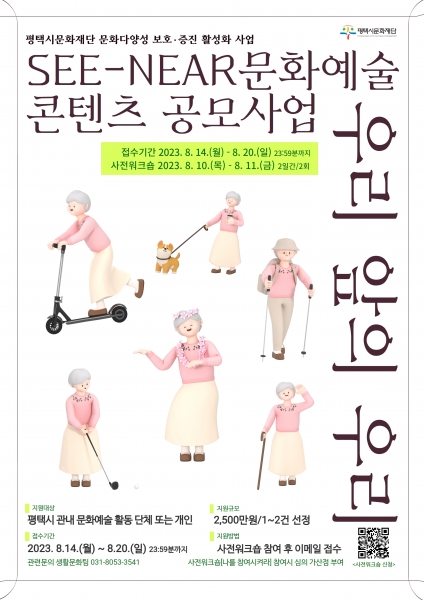SEE-NEAR 문화예술 콘텐츠 공모사업‘우리 앞의 우리’는 시니어 문화예술 콘텐츠 발굴을 통해 고령화 시대 변화하는 시니어에 대한 인식 전환의 기회를 마련하고 시니어 문화예술의 확장과 활성화를 도모하기 위한 사업이다.