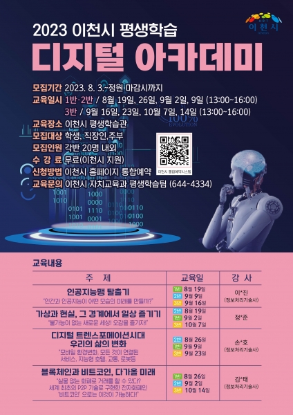 김경희 이천시장은 우리나라 성인과 청소년의 디지털 역량 수준이 OECD 평균보다 약간 낮은 수준으로 사회 수요에 대응해 AI등 디지털 분야에서 활약할 다양한 수준의 인재를 충분히 양성할 필요가 있다고 판단, 일상이나 직장에서 디지털 기술을 자유롭게 적용할 수 있도록 평생교육 차원에서 적극적으로 지원하겠다고 밝혔다평생학습 디지털 아카데미는 이천시청 홈페이지 통합예약을 통해 신청할 수 있으며 자세한 문의는 자치교육과 평생학습팀으로 문의하면 된다.