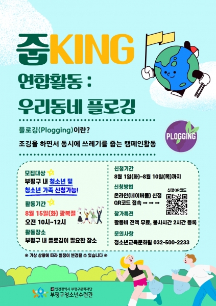 [금요저널] 부평구 청소년수련관이 오는 10일까지 ‘줍KING- 연합활동:우리동네 플로깅’에 참여할 청소년 참가자를 모집한다.
