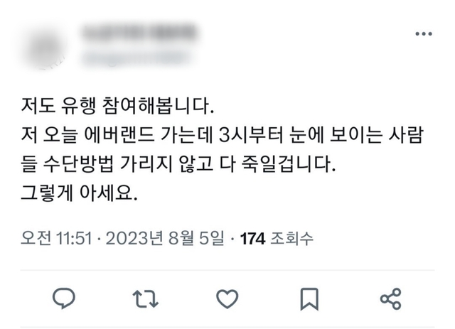 그러면서 “저 오늘 에버랜드 가는데 3시부터 눈에 보이는 사람들 수단 방법 가리지 않고 다 죽일 겁니다. 그렇게 아세요”라고 덧붙였다.
