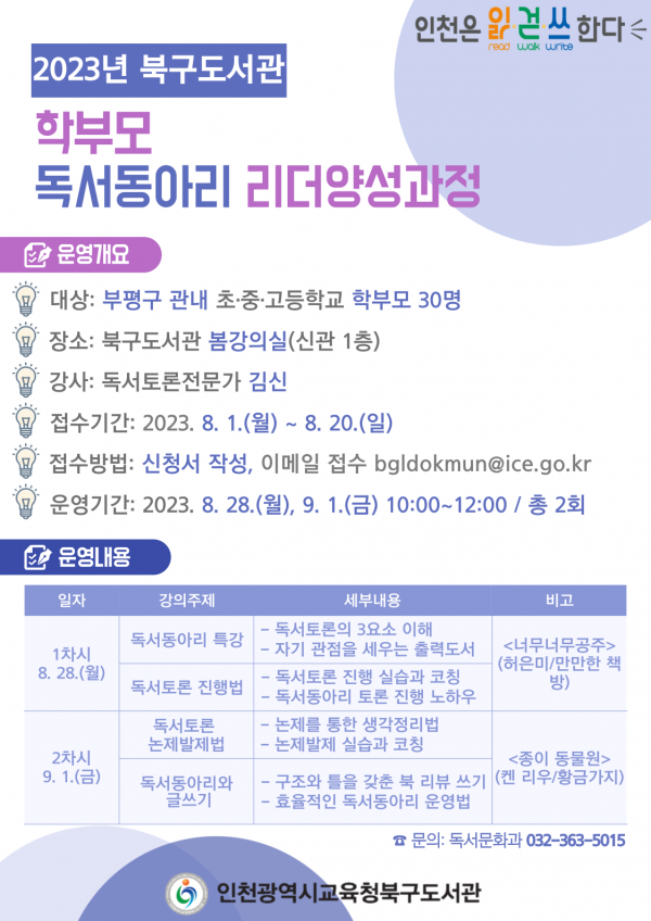 인천광역시교육청북구도서관, 2023년‘학부모 독서동아리 리더양성과정’ 운영
