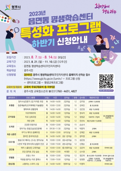 [금요저널] 광주시는 읍면동 지역 특성을 반영한 차별화된 평생학습 프로그램 운영과 시민들의 배움의 가치를 실현하기 위해 오는 14일까지 2023년 하반기 읍면동 평생학습센터 특성화 프로그램 학습자를 모집한다.