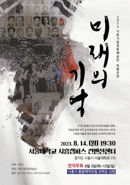 [금요저널] 시흥시는 시립전통예술단 주관으로 오는 14일 서울대학교 시흥캠퍼스 컨벤션센터에서 시립전통예술단의 ‘미래의 기억’ 앙코르 공연을 선보인다.
