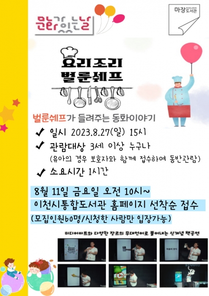 [금요저널] 이천시 마장도서관은 8월 문화가 있는 날을 맞아 연계 공연 [요리조리 벌룬쉐프]를 8월 27일 운영한다.