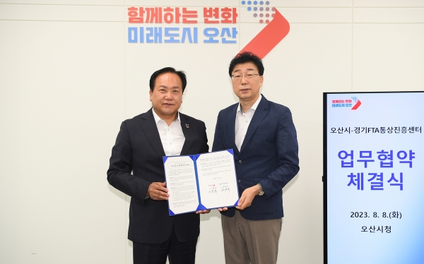 이권재 오산시장은 8일 시장 집무실에서 강경식 경기FTA통상진흥센터장과 ‘기업 글로벌 진출 활성화를 위한 업무협약’을 맺고 이같이 밝혔다.