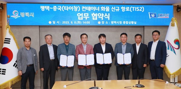 [금요저널] 평택시와 평택시의회, 평택지방해양수산청, ㈜천경해운이 8일 평택시청 종합상황실에서 평택항과 중국 타이창을 연결하는 TIS2항로 운행에 따른 업무 협약을 체결했다.