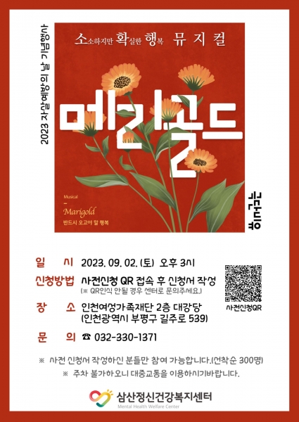 [금요저널] 부평구 삼산정신건강복지센터는 ‘세계 자살예방의 날’을 맞아 오는 9월 2일 오후 3시 인천여성가족재단 대강당에서 생명사랑 뮤지컬 ‘메리골드’를 진행한다.