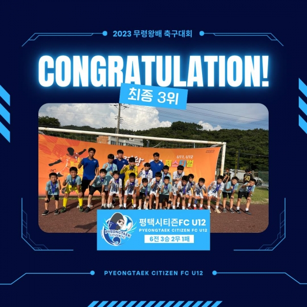 [금요저널] 평택시와 연고지 협약을 맺고 있는 평택시티즌FC 소속 U12 유소년팀이 ‘2023 공주 무령왕배 축구 페스티벌’에서 최종 3위에 등극했다.