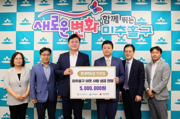 [금요저널] 인천 미추홀구에 있는 롯데백화점 인천점은 지난 10일 인천사회복지공동모금회를 통해 어려운 이웃을 위해 써달라고 성금 5백만원을 미추홀구청에 전달했다.