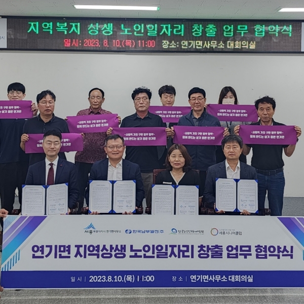 [금요저널] 세종특별자치시 연기면이 지난 10일 한국남부발전㈜신세종빛드림건설본부, 한국노인인력개발원 세종충북지사, 세종시니어클럽과 협약을 맺고 지역주민에 대한 서비스 제공 강화에 힘을 모은다.