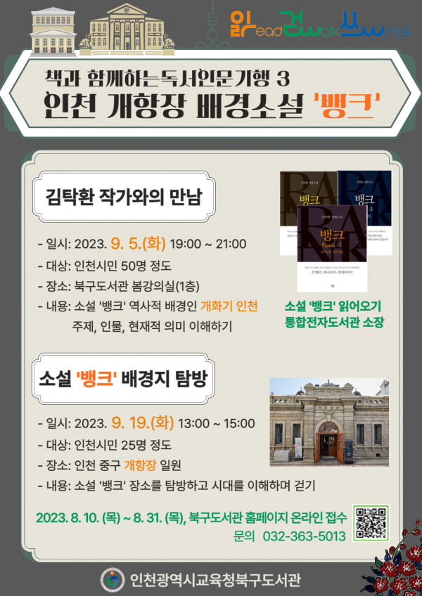 [금요저널] 인천광역시교육청북구도서관은 ‘읽·걷·쓰’ 사업의 일환으로 운영하는 ‘책과 함께하는 독서인문기행’ 3탄 - ‘뱅크’ 김탁환 작가와의 만남 및 개항장 탐방 프로그램 참여자를 31일까지 모집한다.