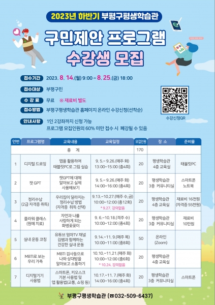 [금요저널] 부평구는 오는 8월 14일부터 25일까지 ‘2023년 부평구 평생학습 하반기 구민제안 프로그램’ 수강생을 모집한다.