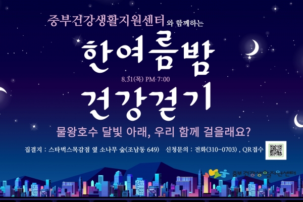 이번 건강걷기는 하루를 마무리하는 저녁시간대를 활용해 가족, 지인과 함께 물왕호수의 아름다운 달빛을 즐기는 행사, 함께 걷는 활동을 통해 나른해진 체력을 한껏 올릴 수 있는 충전의 기회가 될 것으로 보인다.