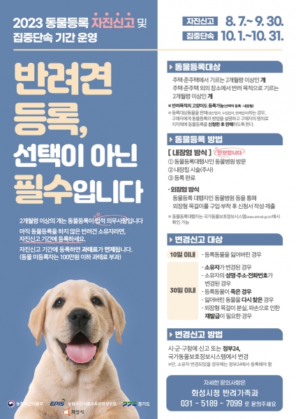 [금요저널] 화성시가 9월 31일까지 반려견 소유자를 대상으로 ‘동물등록 자진신고 기간’을 운영한다.