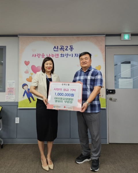 [금요저널] 의정부시 신곡2동주민센터는 8월 10일 아이엠 요양병원 명유미 행정부원장이 사랑의 이웃돕기 성금 100만원을 기탁하며 나눔리더 기부 행렬에 동참했다고 밝혔다.