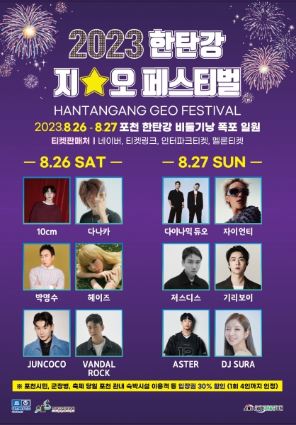 ‘2023 한탄강 지오페스티벌’에는 오는 26일 10cm, 헤이즈, 박명수, 다나카, JUNCOCO, VANDAL ROCK이 출연하며 27일에는 다이나믹 듀오, 자이언티, 저스디스, 기리보이, ASTER, DJ SURA가 출연할 예정이다.