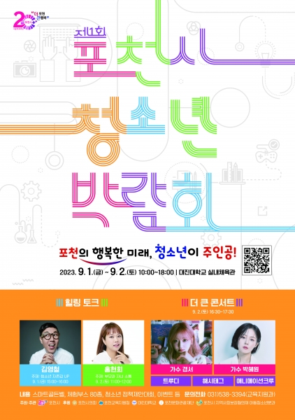 이번 청소년박람회에서는 진로를 탐색 및 직업 체험해보는 현장 체험활동 부스, 포천의 역사를 알아보는 스마트골든벨, 개그맨 김영철 홍현희가 진행하는 힐링 토크, 청소년정책제안발표대회, 경서·박혜원·해시태그·트루디, 팝핀 댄스를 선보이는 애니메이션 크루 등이 참여하는 더 큰 콘서트 등 다양한 프로그램을 진행할 예정이다.