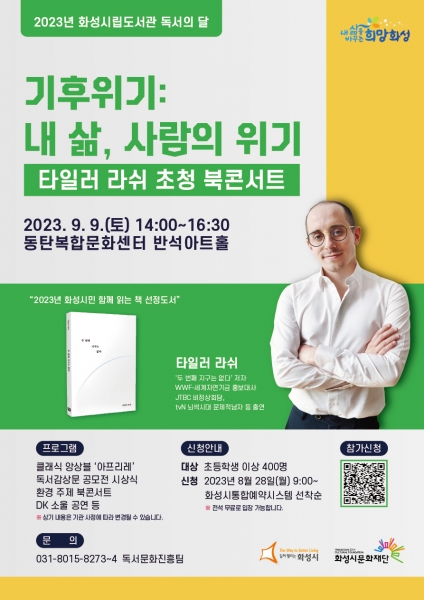 북콘서트는 2023년 화성시민 함께 읽는 책으로 선정된 ‘두 번째 지구는 없다’의 저자 타일러 라쉬를 초청해, ‘기후위기: 내 삶, 사람의 위기’라는 주제로 진행될 예정이다.