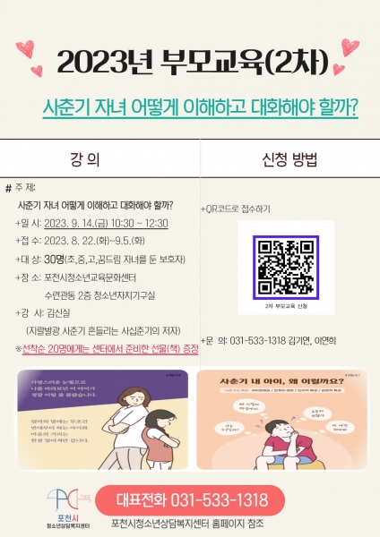 [금요저널] 포천시청소년상담복지센터는 오는 9월 14일 사춘기 청소년 자녀와의 소통이라는 주제로 부모교육을 진행한다.