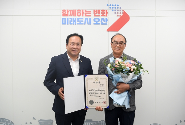 [금요저널] 오산시는 지난 14일 시장 집무실에서 6.25전쟁 참전유공자인 고 이봉환 상사의 유가족에게 화랑무공훈장과 훈장증을 전수했다고 밝혔다.