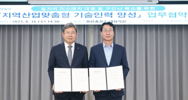 정명근 화성시장을 비롯한 황봉갑 학장 등이 참석한 가운데 체결된 이번 협약에는 지역산업맞춤형 기술인재 양성 화성시 중소기업 수요 맞춤형 인력 양성과정 공동 개발 및 운영 교육수료생의 화성시 관내 기업체 취업연계 기업체 기술지도 및 재직자 직무훈련 직업교육훈련과정 활성화를 위한 교육생 모집 홍보 등의 내용이 담겼다.