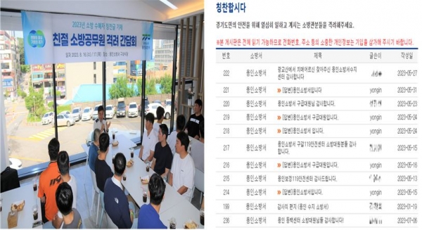 정담회에 참석한 소방공무원들은 경기도소방재난본부 홈페이지 ‘칭찬합시다’ 게시판 등을 통해 도민들로부터 칭찬이나 감사의 글이 적힌 직원으로 밤낮없이 화재, 구조, 구급 등 다양한 현장에서 도민의 안전을 위해 힘쓰고 있으며 친절을 베풀어 용인소방서의 위상을 높인 공헌이 있다.
