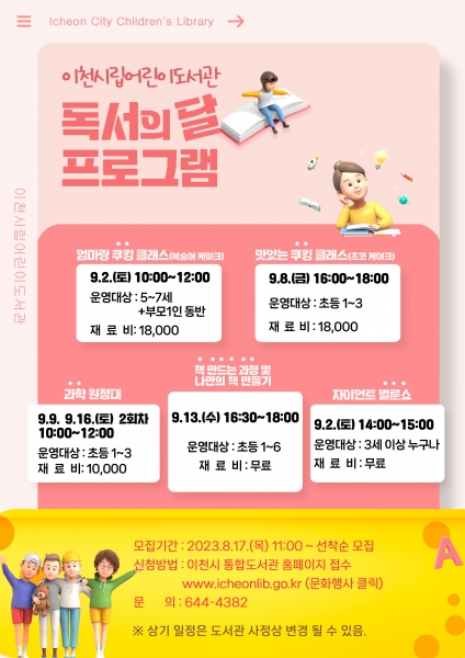 이천시립어린이도서관 독서의 달 행사는 8월 17일 목요일 오전11시부터 이천시통합도서관 홈페이지를 통해 선착순으로 접수 후 참여할 수 있다.
