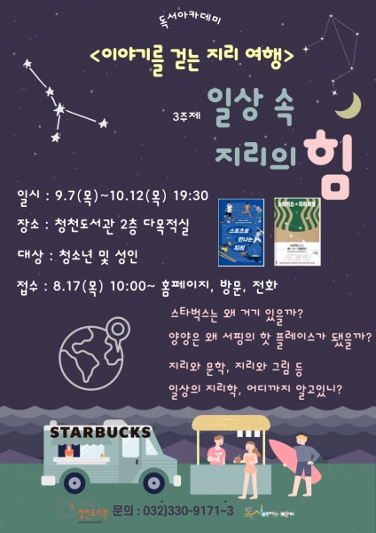 [금요저널] 부평구 청천도서관이 17일부터 독서아카데미 ‘이야기를 걷는 지리 여행’ 제3주제 ‘일상 속 지리의 힘’ 강의 참여자를 모집한다.
