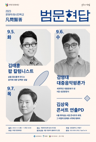 시민의 지식향상과 정서 강화를 목적으로 진행되는 ‘범문현답’이 올해에는 음악도시부평에 걸맞게 대중음악, 음악산업 전문가에게 현장의 노하우를 얻을 수 있도록 기획됐다.