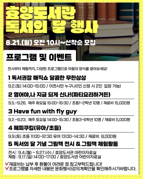 도서관 관계자는 “가을이 시작되는 9월 효양도서관에서 준비한 다양한 독서문화프로그램이 책에 한 발짝 더 가까워지는 계기가 되었으면 좋겠다”고 전했다.