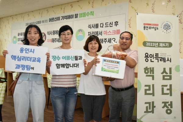 이번 활동은 용인시 핵심리더교육과정 제 6기에 참여하고 있는 26명의 팀원들이 참여했으며 관내에 거주하는 장수 어르신 10명에게 여름철 건강한 식사를 도모할 수 있도록 김치를 포장하고 전달했다.