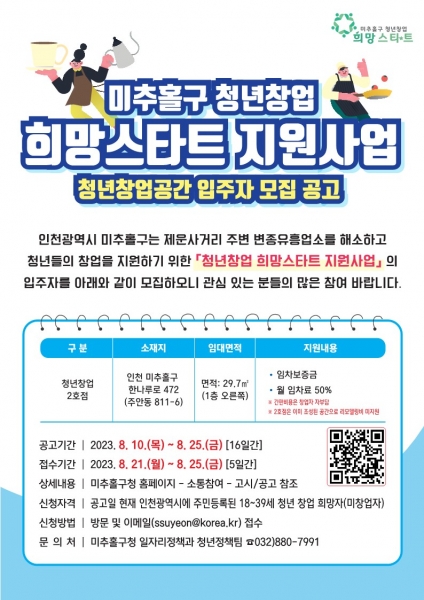 [금요저널] 인천 미추홀구는 이달 25일까지 ‘청년창업 희망스타트 지원사업’의 일환으로 청년 창업 공간 2호점의 입주자를 모집한다.