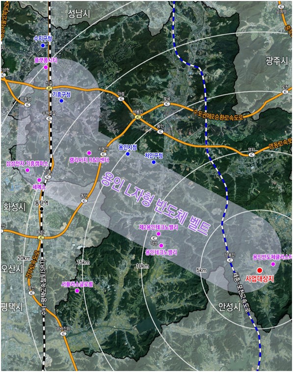 계획은 ▲반도체 산업 육성을 위한 시스템 구축 및 지원정책 수립 ▲국가산업단지 조성 지원 ▲용인 ‘L자형 반도체 벨트’ 조성 ▲용인 반도체클러스터 일반산단 조성 및 인프라 구축 ▲반도체 기업 유치 및 기반 조성 지원사업 등 5개 추진과제를 설정하고 각 추진과제 별로 세부 사업 23개를 구체화했다.