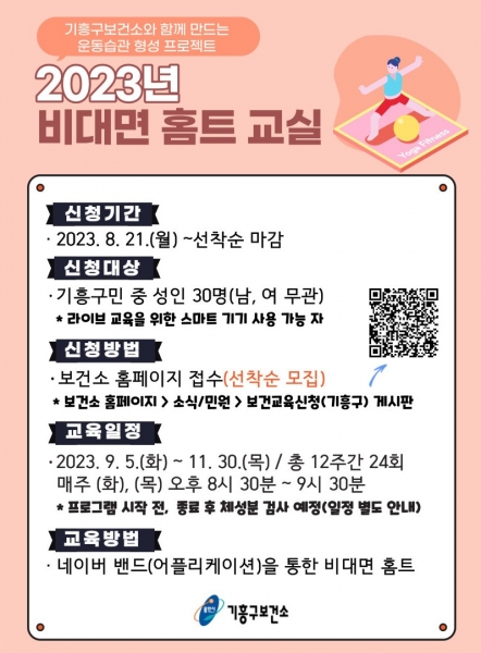 [금요저널] 용인특레시 기흥구보건소가 건강한 생활 습관을 키울 수 있도록 지역 주민을 대상으로 ‘비대면 홈트레이닝 교실’을 운영, 참가자를 모집한다.