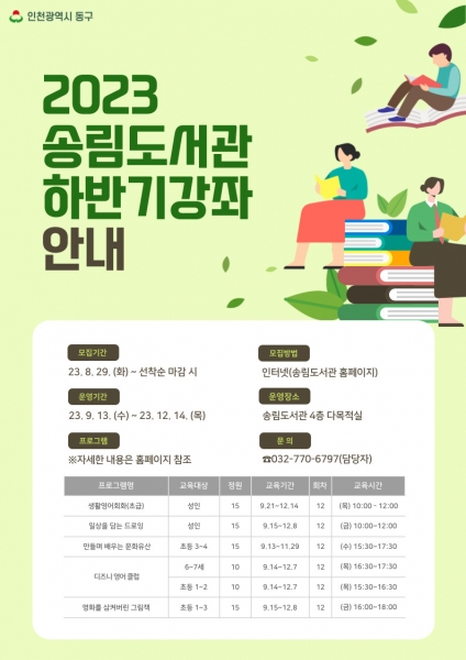 [금요저널] 인천 동구 송림도서관이 2023년 하반기 강좌 수강생을 오는 29일까지 선착순 모집한다.