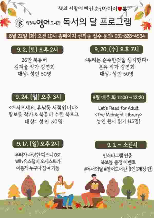 [금요저널] 의정부영어도서관은 독서의 달 9월을 맞아 ‘책과 사랑에 빠진 순간’이란 주제로 독서의 즐거움과 소중함을 알려주는 작가 강연회를 비롯해 원서 읽기, 음악회 등 다채로운 독서문화 프로그램을 운영한다.