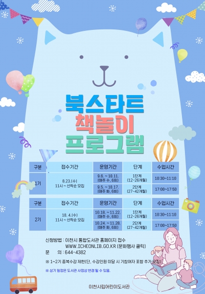 9월 5일에 시작하는 하반기 북스타트 책놀이 1기의 참여자는 8월 23일 수요일 11시부터 이천시통합도서관 홈페이지에서 선착순으로 모집한다.
