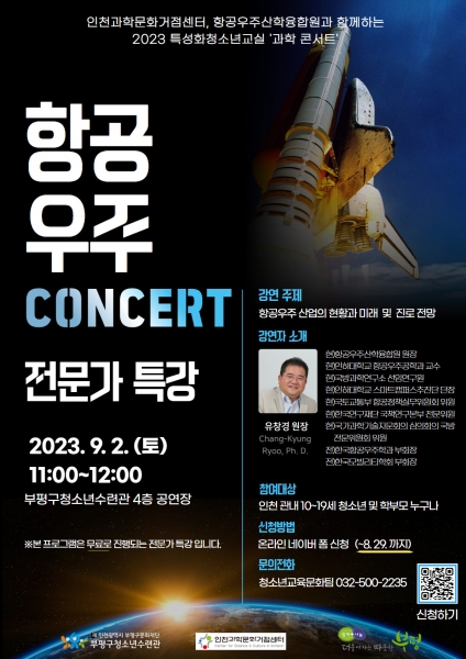박건호 부평구 청소년수련관 관장은 “이번 전문가 특강을 통해 항공우주 산업의 미래를 주도할 청소년들이 과학적 소양을 함양할 기회가 되길 바란다”고 말했다.
