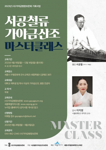 이번 교육은 ㈔가야금병창보존회 주최, 서공철류가야금산조보존회 주관으로 진행된다.