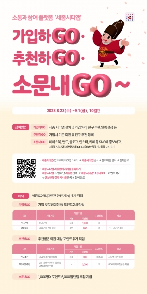 신규 가입과 알림설정, 추천을 받은 회원은 포인트가 2배 적립되며 누리소통망에 서비스 홍보 인증시 세종포인트 5,000점이 추가 적립되는 혜택이 제공된다.