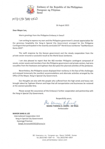 [금요저널] “용인특례시가 베풀어준 환대에 깊은 감사를 전한다”용인특례시는 주한 필리핀 대사관이 ‘2023년 새만금 세계스카우트 잼버리 대회’에서 보여준 시의 따뜻한 배려에 고마움을 전하는 감사 편지 2통을 보내왔다고 23일 밝혔다.