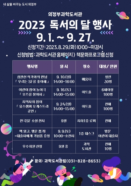 [금요저널] 의정부과학도서관은 9월 독서의 달을 맞아 ‘과학은, SF를 좋아해’를 주제로 9월 1일부터 27일까지 작가 강연회, 놀이극, 공연, 도서 전시 등 다양한 독서 문화 프로그램을 운영한다.