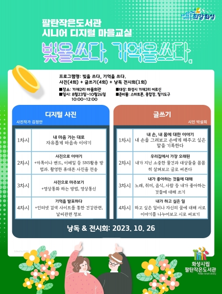 [금요저널] 화성시 시립 팔탄작은도서관이 지역사회협업 프로그램 ‘빛을 쓰다, 기억을 쓰다’를 운영한다.