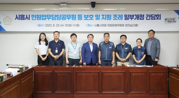 [금요저널] 경기 시흥시의회는 8월 23일 ‘시흥시 민원업무담당공무원 등 보호 및 지원 조례’ 개정에 앞서 관계부서의 의견을 수렴하기 위해 간담회를 진행했다.
