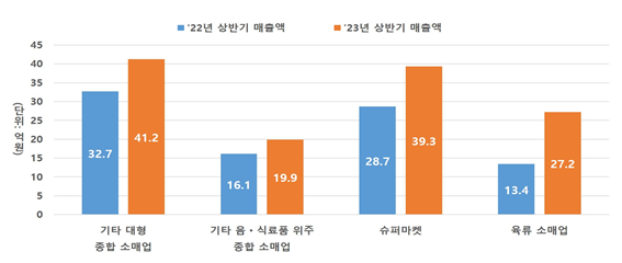 뒤를 이어 슈퍼마켓이 10억 6,000만원, 기타 대형 종합 소매업이 8억 5,000만원, 기타 음·식료품 위주 소매업이 3억 8,000만원 순으로 매출액이 증가했다.