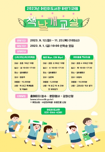 제33기 ‘책날개 교실’은 이천시 거주 초등학생을 대상으로 1학년, 4~6학년 총 3개 반으로 구성되며 오는 9월 12일부터 11월 23일까지 매주 화, 수, 목요일 10차시 수업으로 운영될 예정이다.