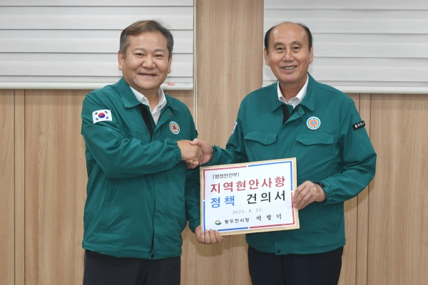 [금요저널] 박형덕 동두천시장은 지난 23일 동두천 시민회관에서 이상민 행정안전부장관을 면담하고 정부의 미군 공여지 반환 지연에 따른 행정안전부의 대책을 촉구하는 건의문을 전달했다.