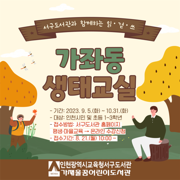 [금요저널] 인천광역시교육청서구도서관은 자연환경과 생태계에 대한 이해를 높이는 ‘읽·걷·쓰’ ‘가좌동 생태교실’ 프로그램 참여자를 모집한다고 24일 밝혔다.