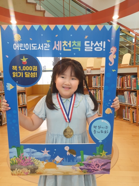 김하린 어린이는 8월 11일 어린이도서관에 방문해 세천책 달성 인증서와 메달을 받았다.
